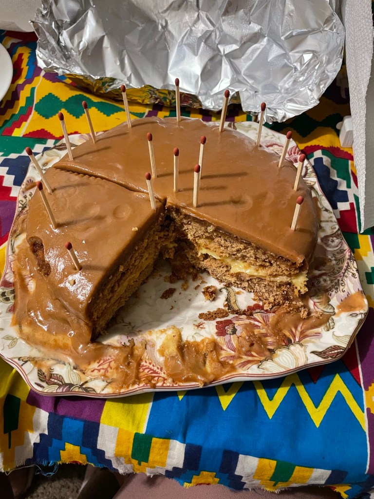 The matches were cause i couldn’t find toothpicks, to hold the foil off the cake’s PB Glaze! Glaze wonderful! 1 part sugar, 1 part pb flour, 2 parts water!